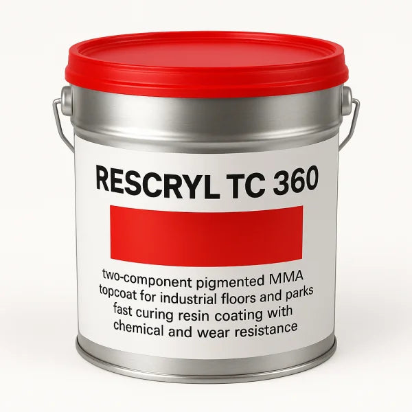 RESCRYL TC 360 is a pigmented, slightly elastic, medium-viscosity two-component methyl methacrylate (MMA) resin topcoat. It is designed for industrial floors and car parks, both indoors and outdoors, offering excellent wear resistance, chemical resistance, and rapid curing for quick return to service.